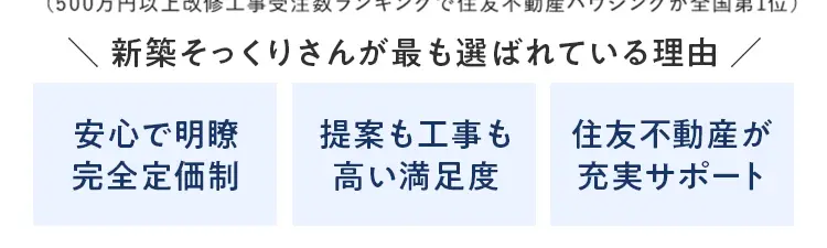 Point 01 住友不動産で建てた家じゃなくても 大丈夫です Point 02 すべて一貫して 専属のセールス エンジニアが担当 Point 03 専属の棟梁が 施工統括者として 着工から完成まで担当
